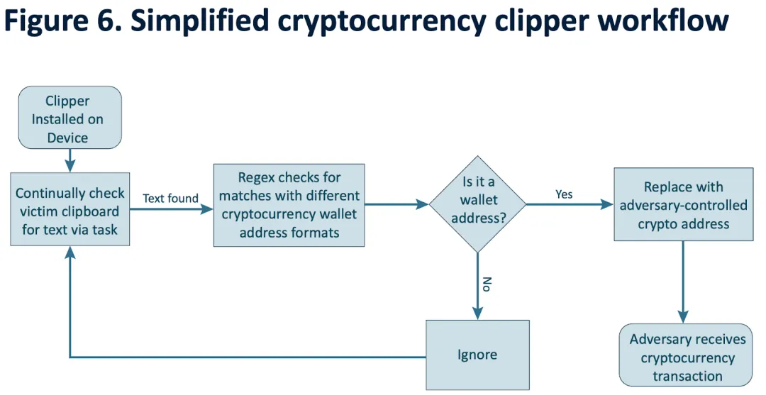 有些剪贴板恶意软件专门用于篡改地址,2024 年联合国毒品和犯罪问题办公室发布的东南亚跨国有组织犯罪的欺诈报告提到,东南亚犯罪集团常用的一个恶意软件是剪切器。这种软件监控受感染系统的剪贴板,伺机替换加密货币交易中的地址,一旦受害者无意中进行交易,就会将资金转移到攻击者的地址上。由于加密钱包地址通常很⻓,导致用户不太会注意到收款地址的变化。
