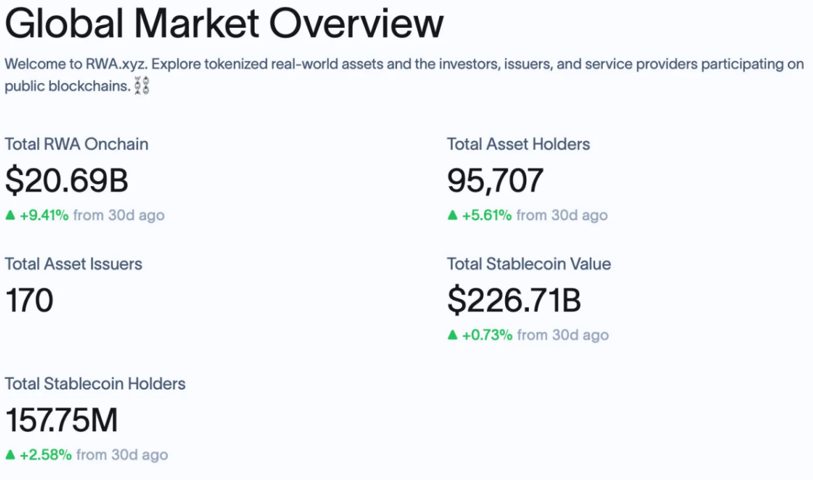 据 rwa.xyz(RWA 的专业分析网站)数据,如今链上 RWA 资产的总值为 206.9 亿美元(不包含稳定币),其主要构成为私人信贷、美债、大宗商品、房地产、股票证券。