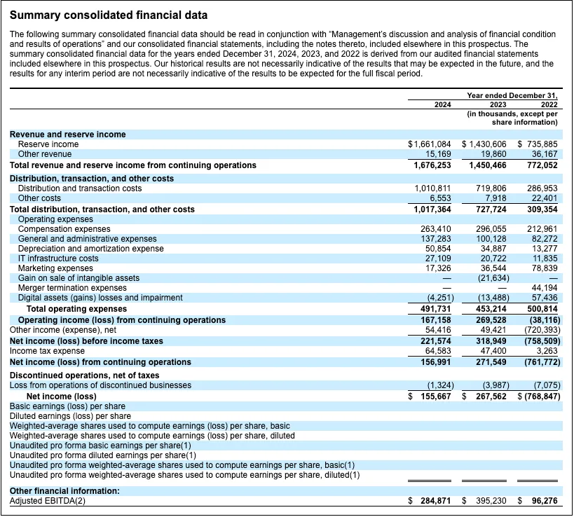 对于发行的每一美元 USDC,Circle 将储备投资于高流动性、低风险资产组合,如短期美国国债和现金存款。这种结构使 Circle 能够在确保 USDC 持有者流动性和赎回稳定性的同时,从储备中获得收益。Circle 在文件中披露,2024 年储备收入为 16 亿美元,占总收入的 99%,表明其收入结构高度依赖利率。