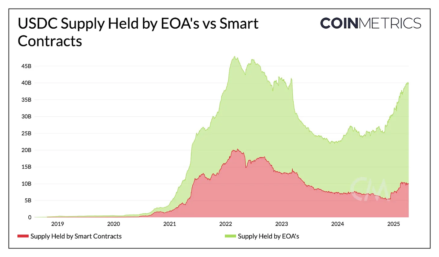 通过区分以太坊上持有在智能合约与外部拥有账户 (EOA) 的 USDC 供应,可以了解 USDC 在用户钱包和应用中的分布情况。目前,约 300 亿美元由 EOA 持有,同比增长 66%,而约 100 亿美元在智能合约中,同比增长约 42%。EOA 余额的增长可能反映了交易平台托管和个人用户持有的增加,而智能合约的增长表明 USDC 在 DeFi 借代市场中作为抵押品以及去中心化交易平台 (DEX) 流动性的重要性。