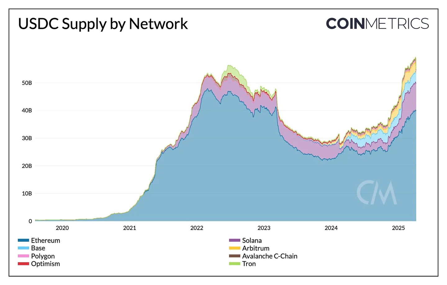 USDC 的总供应量已增长至约 600 亿美元,稳居仅次于 Tether 的 USDT 的第二大稳定币。尽管 2023 年市场份额承压,但已回升至 26%,反映了市场信心的恢复。其中,约 400 亿美元 (65%) 在以太坊上发行,95 亿美元在 Solana 上 (15%),37.5 亿美元在 Base Layer-2 上 (6%),其余分布在 Arbitrum、Optimism、Polygon、Avalanche 等链上。