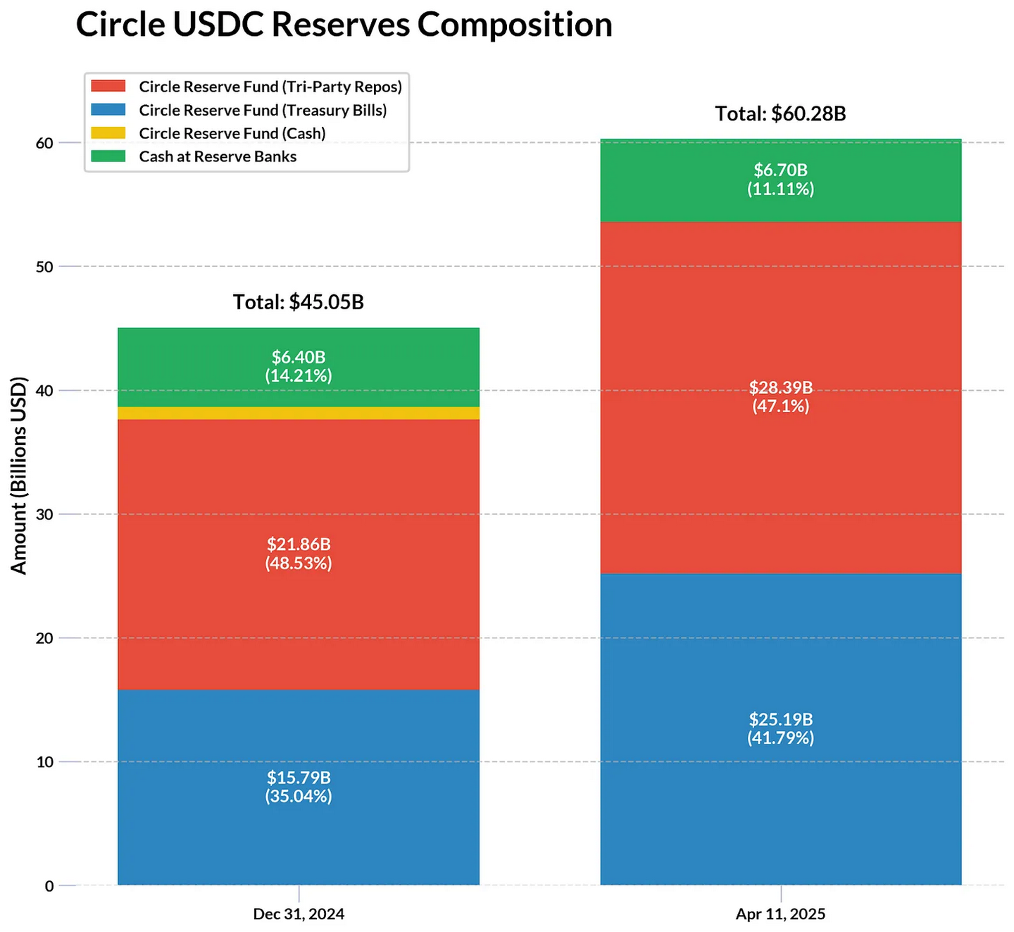 USDC 储备主要持有在 Circle 储备基金中,这是一个由 BlackRock 管理的 SEC 注册政府货币市场基金。根据 Circle 的月度证明、财务报表和 BlackRock Circle 储备基金,截至 4 月 11 日,535 亿美元 (约 88%) 的 USDC 储备由美国国债和与多家金融机构的隔夜回购协议组成,期限均小于 2 个月。此外,11% 的储备为存放在受监管银行的现金。